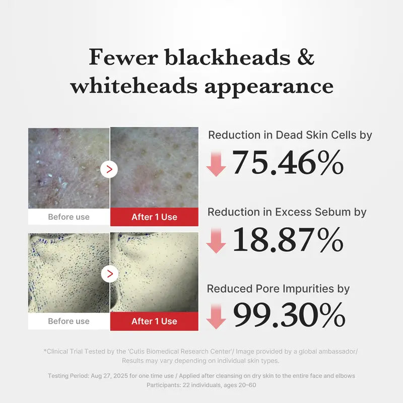 Complete Duo for Face & Body: - For Face: Helps clear away pore-clogging buildup and visible excess sebum, leaving the skin looking smoother, clearer, and more refined. - For Body: Improves rough, uneven areas such as elbows, knees, underarms, heels, and ankles, helping address concerns like rough bumps or visible pores on arms and legs. Clarify & Balance & Pore-care: - Helps sweep away hidden impurities and dead skin buildup for smoother and clearer skin tone, smaller-looking pores Low-Irritation Formula: - Designed to be gentle and suitable for all skin types without pain or harsh physical exfoliation. Targets only real dead skin cells: - Specially formulated to react only on the skin Easy to Use: - Simply massage away the excess sebum and dead skin cells for effortless at-home care with no pain or discomfort. [POWERED BY]